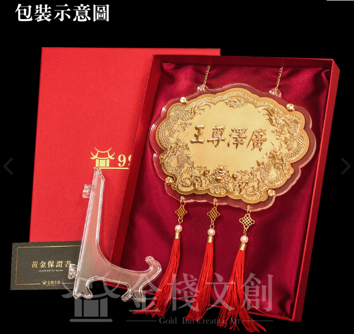 客製化9999純金神明金牌,皆附有雙面壓克力固定、流蘇配件(紅色)、擺設腳架(吋半除外)、掛鍊及精美手工包裝紅禮盒及純金9999保證書!