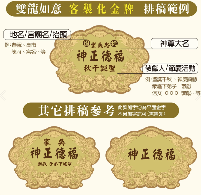 客製化9999純金神明金牌,皆附有雙面壓克力固定、流蘇配件(紅色)、擺設腳架(吋半除外)、掛鍊及精美手工包裝紅禮盒及純金9999保證書!